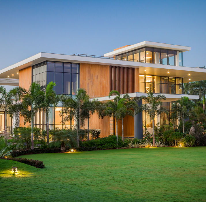 The interplay of solid and void creates a light-filled, well-ventilated home with strong connections to the landscape. The architecture is articulated through a clear solid-void composition, with the façade crafted using teakwood stone, concrete, and glass. This combination creates a balanced expression of warmth and modernity, giving the home a distinctive yet understated character.