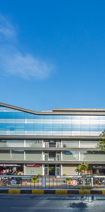 Designed as a prominent retail and business hub, the project creates a strong visual presence that naturally captures the attention of passersby. Extending nearly 300 feet along the main road, the building’s elongated façade departs from the rigid uniformity often seen in commercial complexes and instead expresses a sense of fluidity and movement. The exterior combines two shades of blue glass with a deep grey structural frame, resulting in a striking and contemporary composition that gives the development a dynamic character. The complex accommodates a range of commercial establishments including banks, retail outlets, and cafés, with expansive glass-fronted shops and showrooms positioned to ensure maximum visibility from the street. Internally, the main foyer functions as the central organizing axis of the building, guiding circulation throughout the complex. The shared spaces are carefully designed with coordinated materials and finishes that add an element of elegance, allowing the project to maintain a distinctive architectural identity while supporting a straightforward and efficient commercial layout.