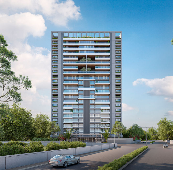 Set within a well-developed neighbourhood, the project enjoys a picturesque setting, with the building oriented towards a lake, providing serene views and a calming living environment. The architecture is defined by clean lines and a strong solid-void composition, articulated through balconies of varying depths. These staggered balconies create a dynamic and visually engaging façade.