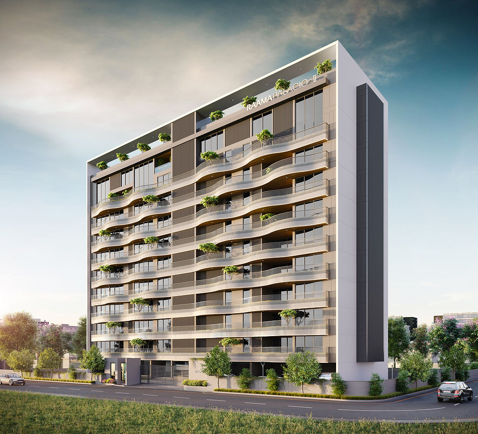 Raamah Palacio II is a contemporary residential project defined by clean lines and a distinctive wave-like balcony feature.