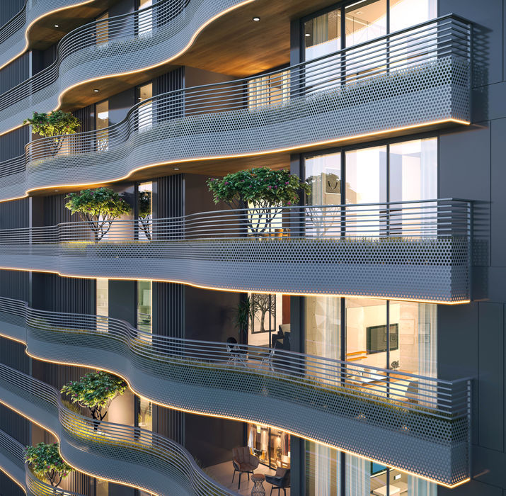 The design combines thoughtful planning with a strong architectural identity to enhance modern living. The architecture is articulated through a striking balcony element that forms fluid, wave-like projections, creating a focal point within an otherwise restrained building form. This feature adds movement and visual interest to the façade.