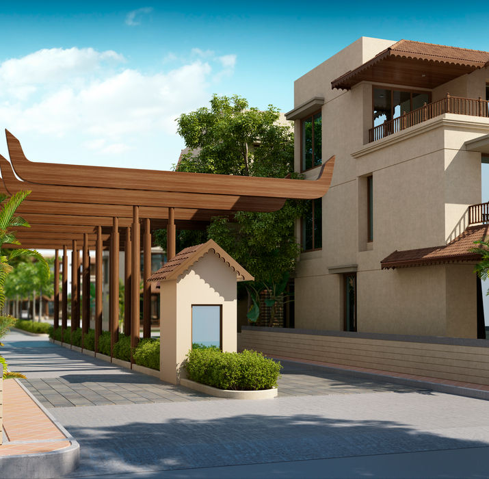 The architecture reflects a balanced fusion of traditional and contemporary influences. The exteriors of these two-storey 4 BHK homes express a strong vernacular character, while the interiors are kept minimal and functional to support everyday living.